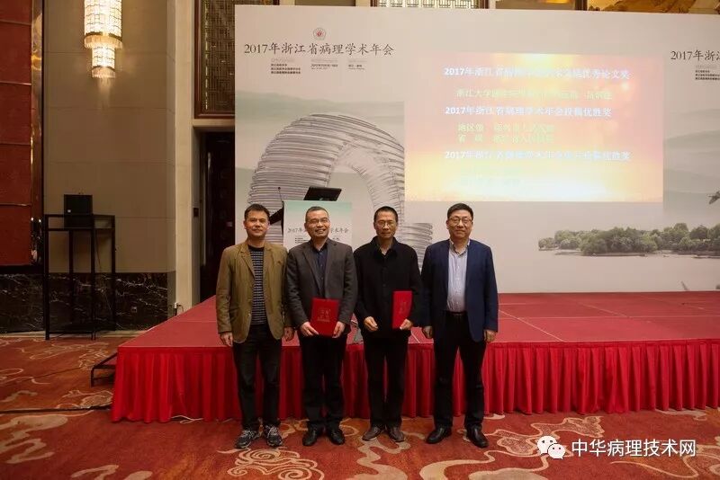 颁发了浙江省病理事业特殊贡献奖,许敬尧、严蕊龄、曹江分别代表病理医生和病理技术员领了奖,